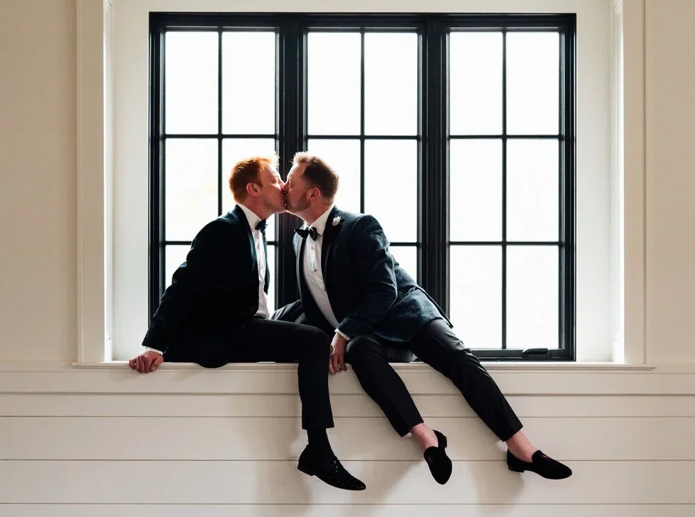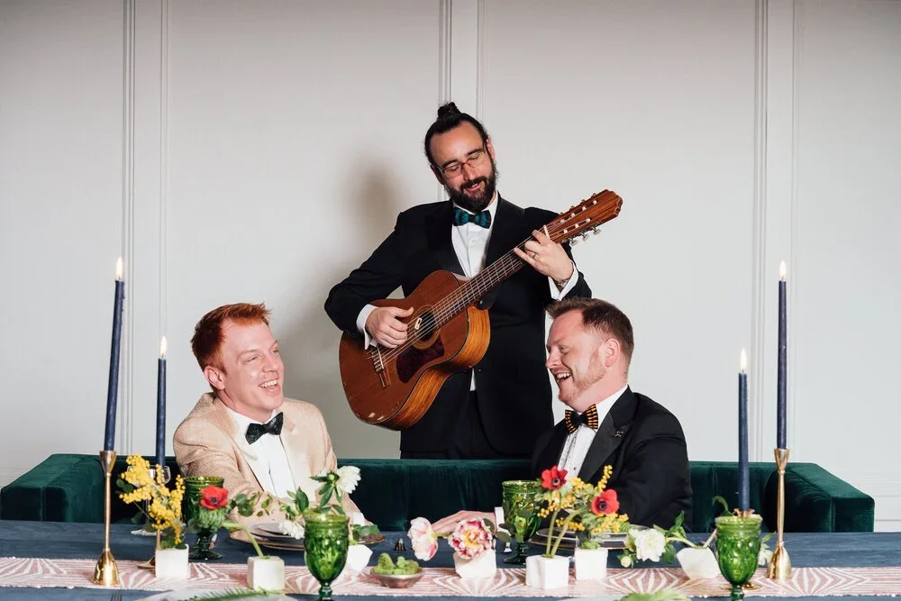 Every intricate element was thoughtfully planned out, with a focus on fashion and artisan pieces. The grooms’ wedding outfits perfectly complemented one another and were styled by TJ Bailey’s and accessorized with meticulously handcrafted Brackish Bowties in shades of peacock blue and handmade jewelry from Jannie Bean…The color palette of the day was cohesive everywhere you turned. The vibrant buds that decorated the reception table accented their way through the bountiful charcuterie spread. A simple ombré cake brought out the deep blue shades sprinkled throughout the décor as a strong metallic accent wrapped its way around the cake, the way the bespoke gold wedding bands wrapped around the grooms’ fingers.”